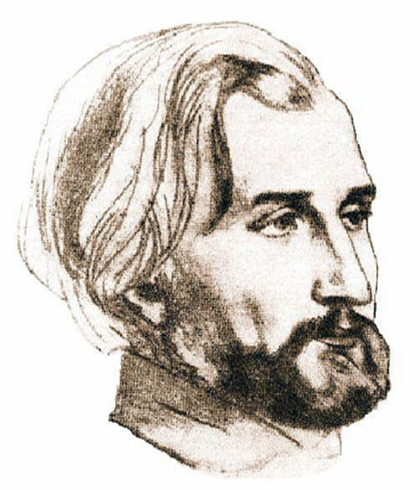 «Он стоял у двери, опираясь на косяк, и, скрестив руки на широкой груди, с недовольным видом посматривал кругом. Помню его смуглое небольшое лицо, его африканские губы, оскал белых крупных зубов, висячие бакенбарды, тёмные желчные глаза под высоким лбом почти без бровей – и кудрявые волосы… Он на меня бросил беглый взор; бесцеремонное внимание, с которым я уставился на него, произвело, должно быть, на него впечатление неприятное: он словно с досадой повел плечом – вообще он казался не в духе – и отошёл в сторону».