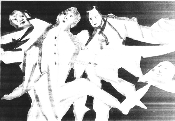 Я почти закончил работу над серией, когда нашлись ещё три листа. Среди них был один, которое многое объяснял, я принял его за символ. Монстры в листах были, такие же типичные, от Гойя, той же степени бредовости и ужаса… Когтистая тварь в балахоне безжалостно топчет человеческое тело: