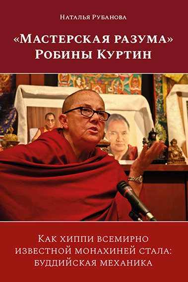 На обложку книги Натальи Рубановой «“Мастерская разума”» Робины Куртин» помещён портрет досточтимой как раз в момент её страстного общения с аудиторией. А за ней, на алтаре, – портреты Его Святейшества Далай-ламы и ламы Еше.