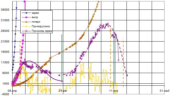 Так и оказалось, если судить по статистике заражений, отражающей, хотя и однобоко, качество всей нашей личной и общественной активности. А как мы видим на рисунке, число заражений и прирост вирусоносителей резко сокращались всю неделю практически строго по расчетной турбулентной волне, показывая наше адекватное календарю перемен здоровое поведение.