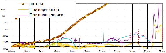 Прирост вновь зараженных и больных (вирусоносителей) в России (точки) вместе с экстраполяцией измерительных данных по модели турбулентной волны (волнистые линии). Сплошными зелеными линиями отмечены начала 8-месячных зон календаря перемен, красными – начала 2-х недельных турбулентных периодов. Последние две волны являются предварительным прогнозом от 31 мая 2021, который необходимо уточнять каждую неделю.