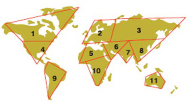 Карта ячеистой версии 2001 г. многополюсного мира Е. Примакова 1996 г, (https://www.ng.ru/style/2001-05-16/16_pole.html)