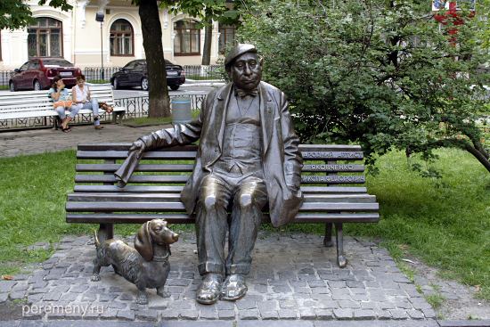 Третья скамейка неожиданно оказывается не деревянной, а чугунной. На ней сидит памятник. Памятник выглядит как Юрий Никулин у цирка на Цветном в Москве, но на самом деле это какой-то украинский актер… Каждый прохожий считает необходимым присесть рядом с памятником и сфотографироваться. Некоторые даже садятся к нему на колени… Или – верхом на чугунную собачку, которая сидит в ногах памятника.