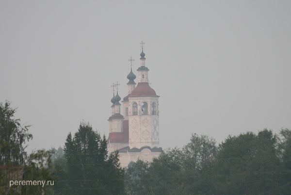 Тотьма поднялась на добыче соли, как, впрочем, и Солигалич (Соль Галицкая). Впоследствии Тотьма стала пунктом транзитной торговли. Тотьмичи двинулись на Камчатку, Аляску, Алеутские острова. В 1812 году тотьминский мужик Иван Кусков основывает в Калифорнии крепость – Форт Росс. В самой Тотьме строились великолепные храмы. Тотьминское барокко не спутаешь ни с чем. На фоне дымки оно в это раз смотрелось как аппликации на серой подложке (кстати, единственный кадр в этом трипе, где есть настоящее, не задымленное, небо, – это кадр Солигалича, взятый из старой съемки, ибо в этот раз в Солигаличе мы ничего не успели снять).