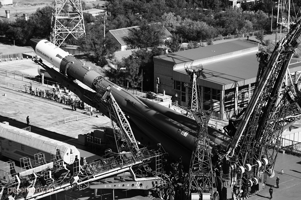 Далее поезд с ракетой пребывает на легендарный Гагаринский старт. Начинается вертикализация. Действие изящное и не лишенное эротизма. Так считает моя знакомая журналистка. Сочиняя сюжет для федерального российского канала, она как-то написала: «Когда происходит вертикализация и ракета поднимается – она как будто становится больше, и даже звери приходят на нее посмотреть!». Здесь нет художественного преувеличения. Я своими глазами видел одного такого зверя. Это суслик, его нора находится недалеко от стартовой площадки. Пушистый житель космодрома вышел, встал на задние лапы, застыл на мгновение, принюхался, нет ли какого подвоха, осторожно приблизился, покосил глазом на ракету, на всякий случай немного погрыз камеру – убедившись, что штука несъедобная, юркнул обратно в свой домик.