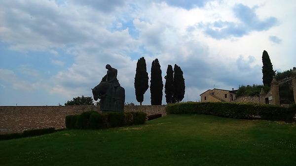 И вот, купив икону и выйдя из базилики св. Франциска, я увидел эту скульптуру, памятник св. Франциску. Франциск на коне с опущенной головой. И подпись: «св. Франциск сдается Богу». И сразу вспомнил слова учителей о необходимости сдаться на волю Божию, отказавшись от своих желаний и привязанностей, отказавшись от того, чтобы считать себя отдельным существом, которое что-то решает, что-то делает, выбирает и якобы имеет свою независимую свободную волю. Я вспомнил биографию Франциска: он был наследником очень богатых родителей, вел распутный и бесшабашный образ жизни, не знал недостатка ни в деньгах, ни в веселых вечеринках, ни в женском внимании. А потом вдруг отрекся — и от всего своего наследства, и от своего образа жизни. И сдался Богу.